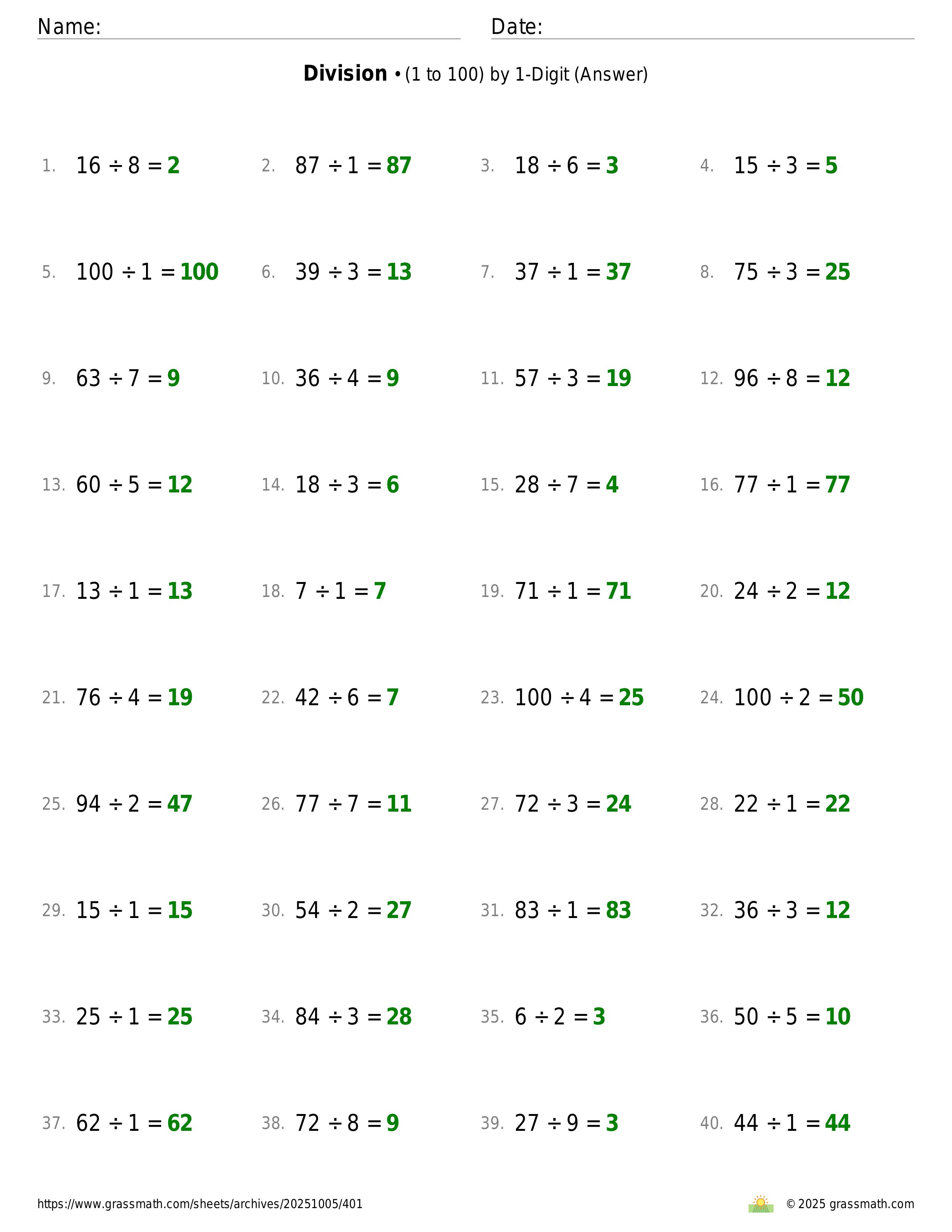 Division (1 to 100) by 1-Digit