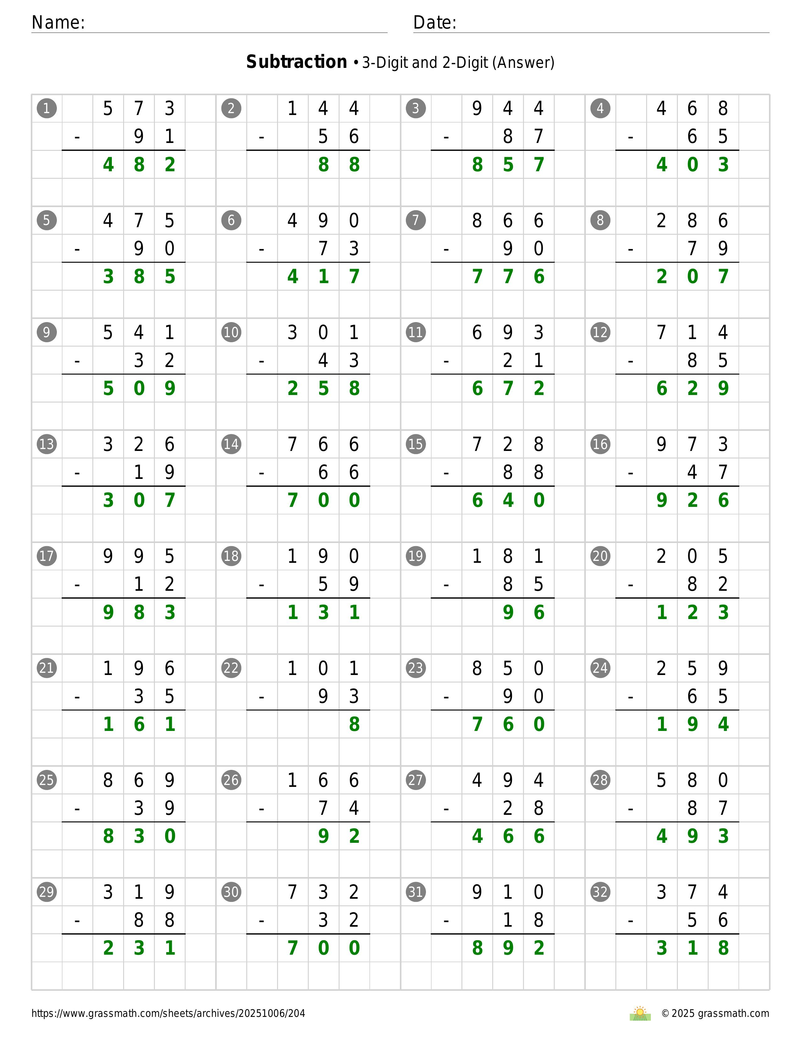 Subtraction 3-Digit and 2-Digit