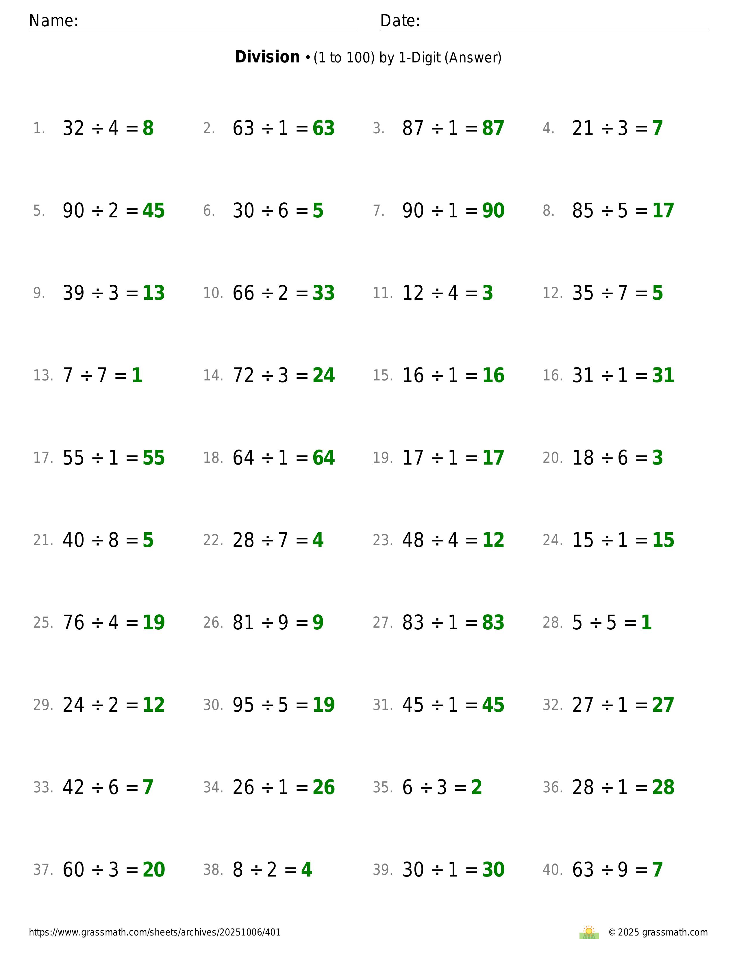 Division (1 to 100) by 1-Digit