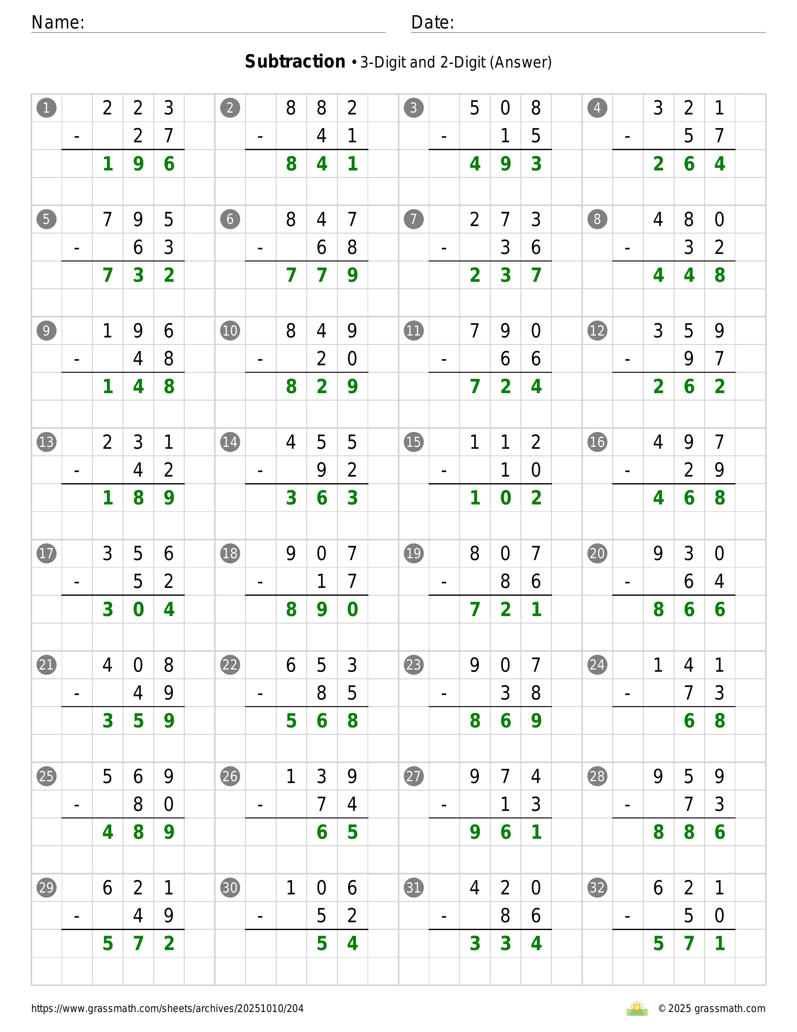 Subtraction 3-Digit and 2-Digit