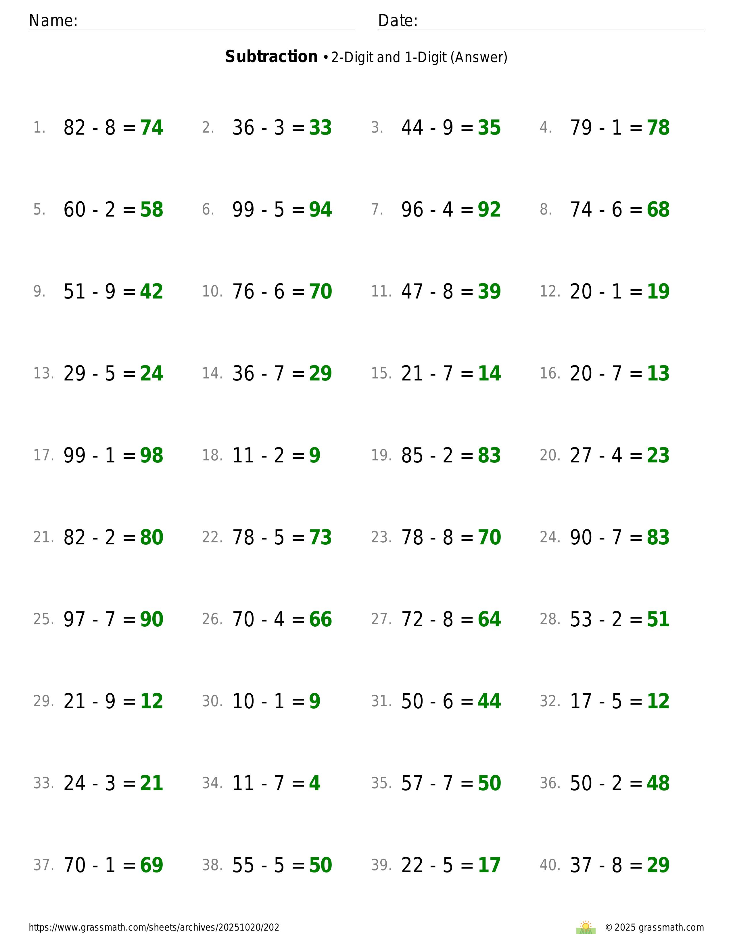 Subtraction 2-Digit and 1-Digit