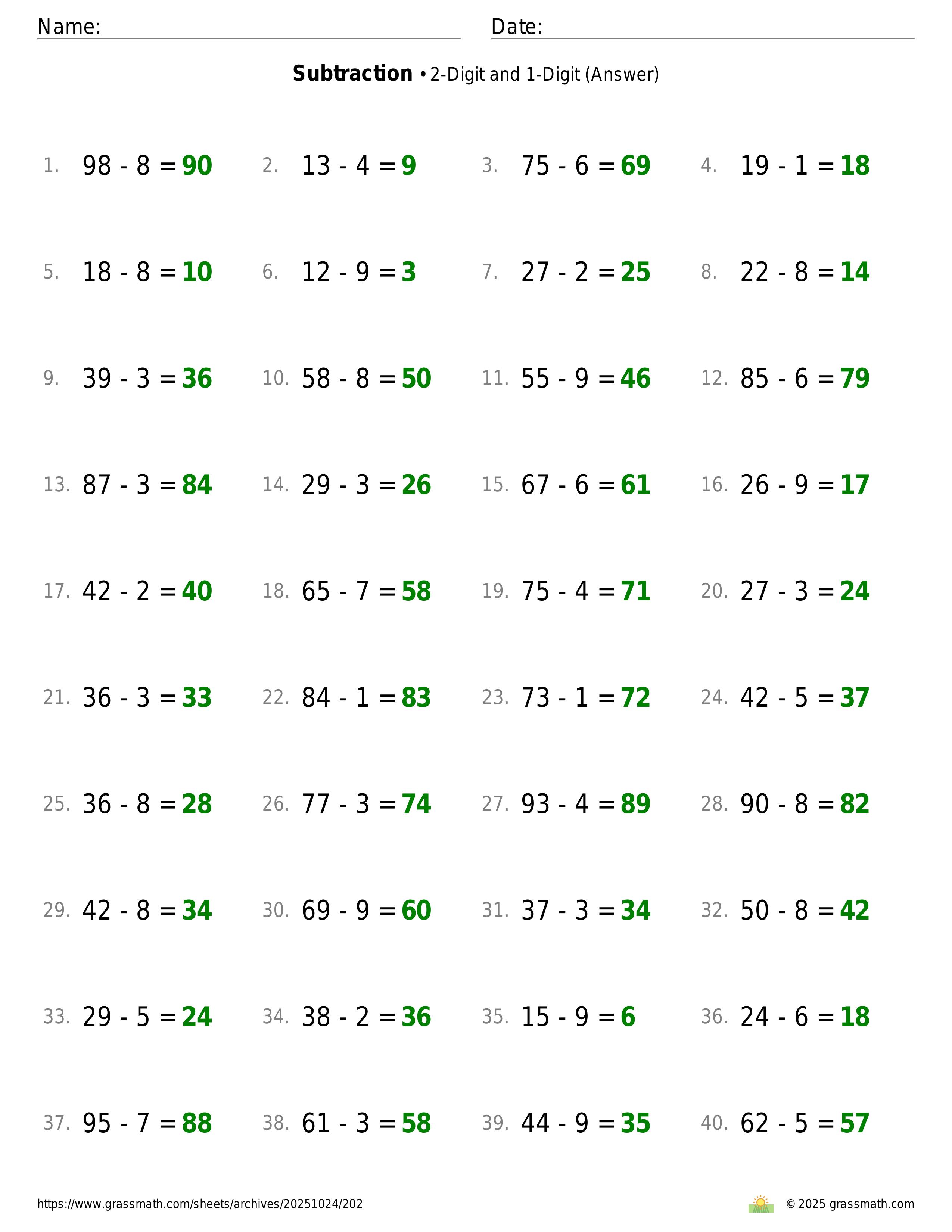 Subtraction 2-Digit and 1-Digit