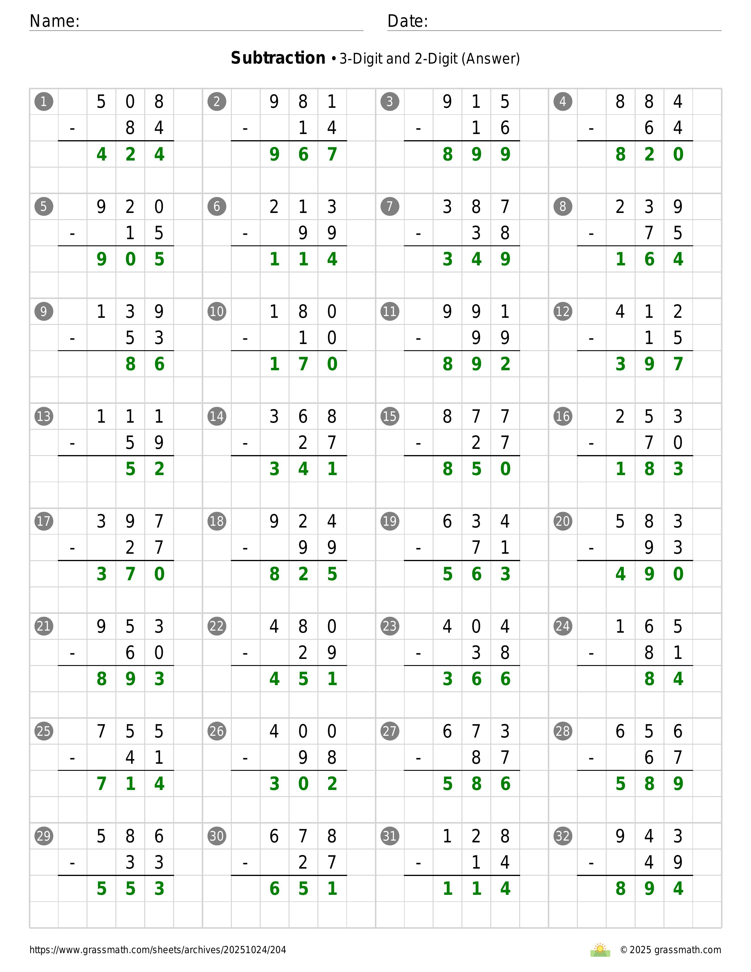 Subtraction 3-Digit and 2-Digit