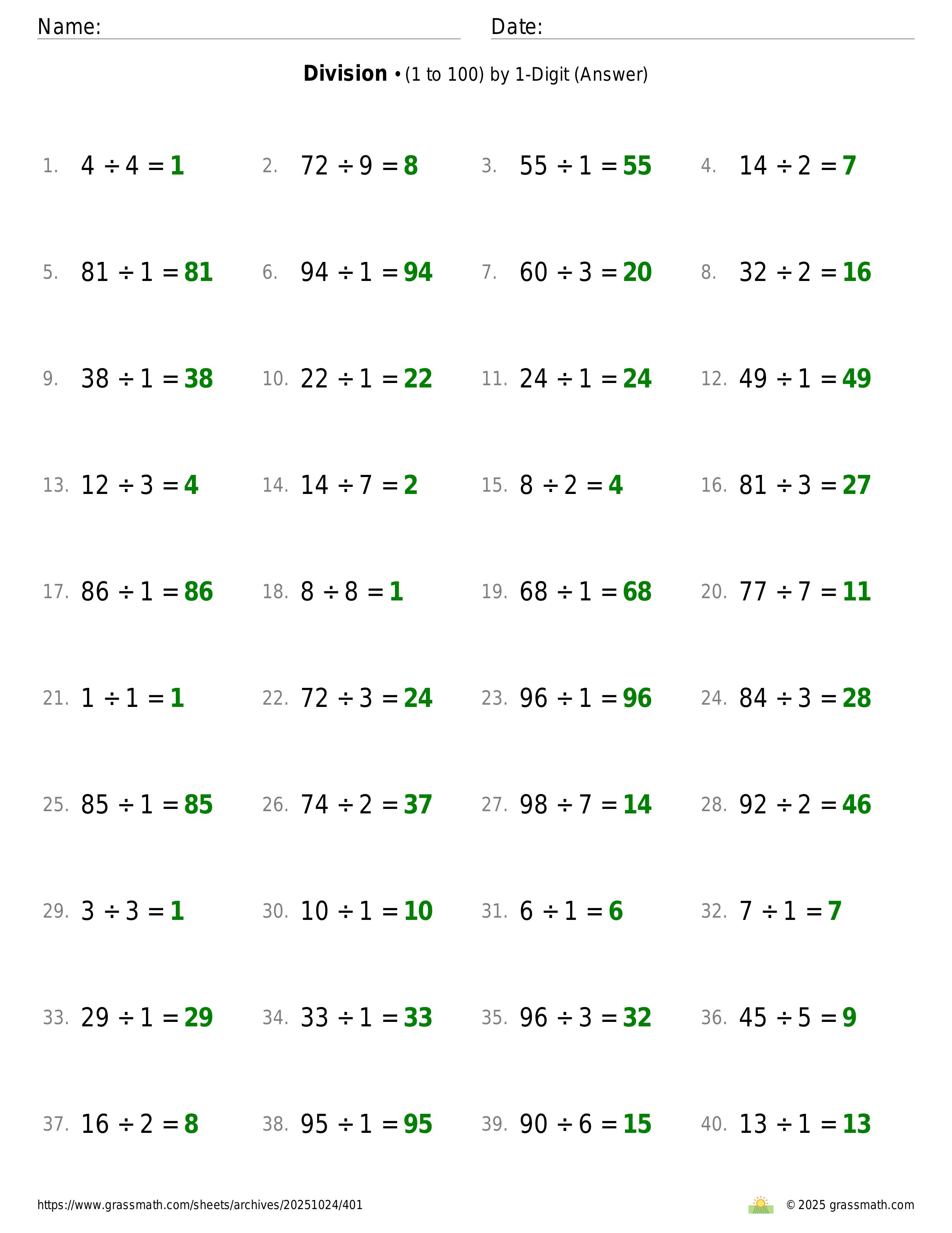 Division (1 to 100) by 1-Digit
