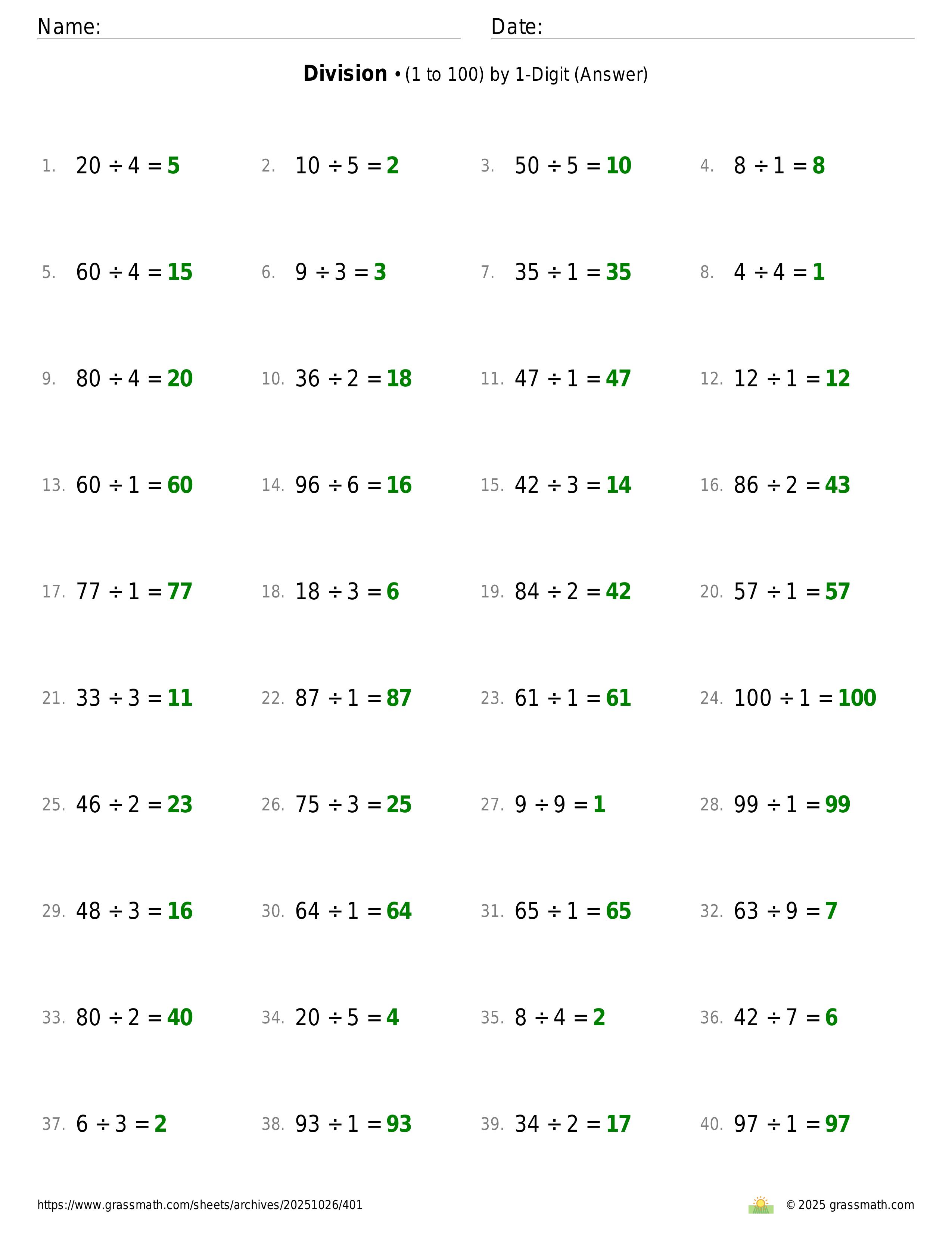 Division (1 to 100) by 1-Digit