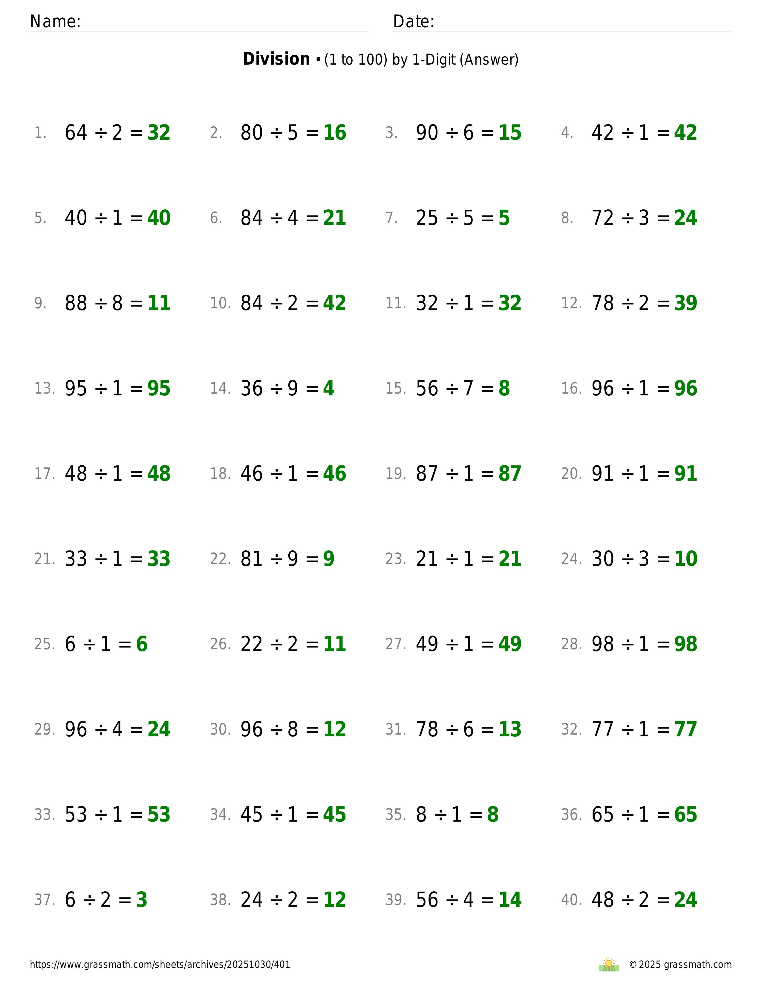 Division (1 to 100) by 1-Digit