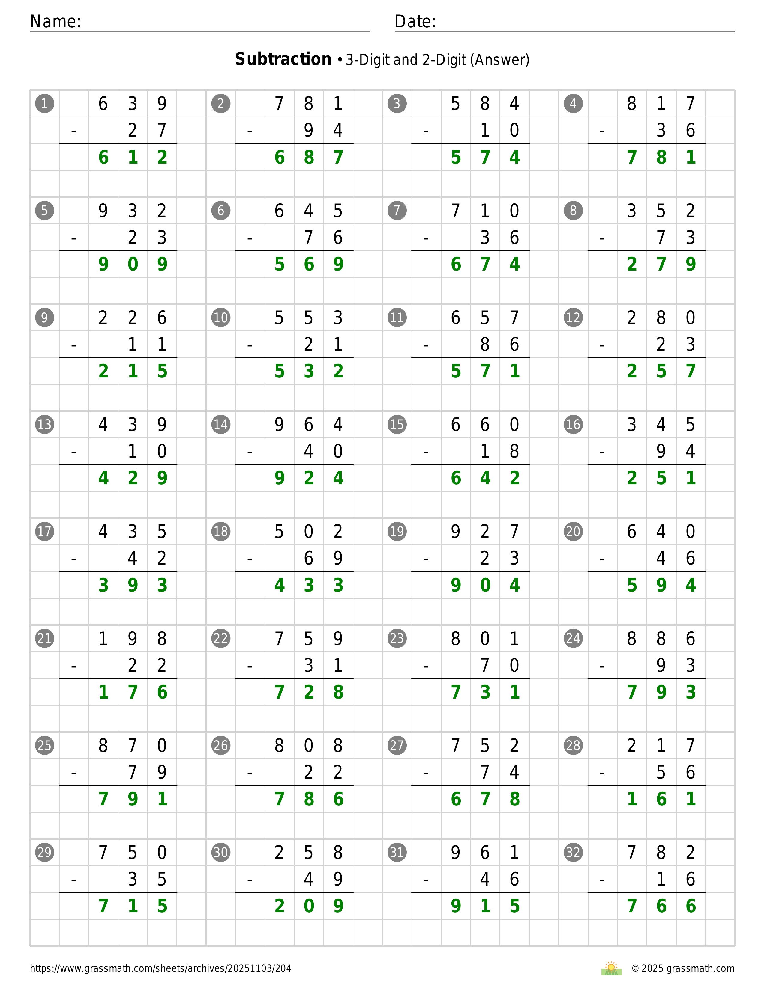Subtraction 3-Digit and 2-Digit