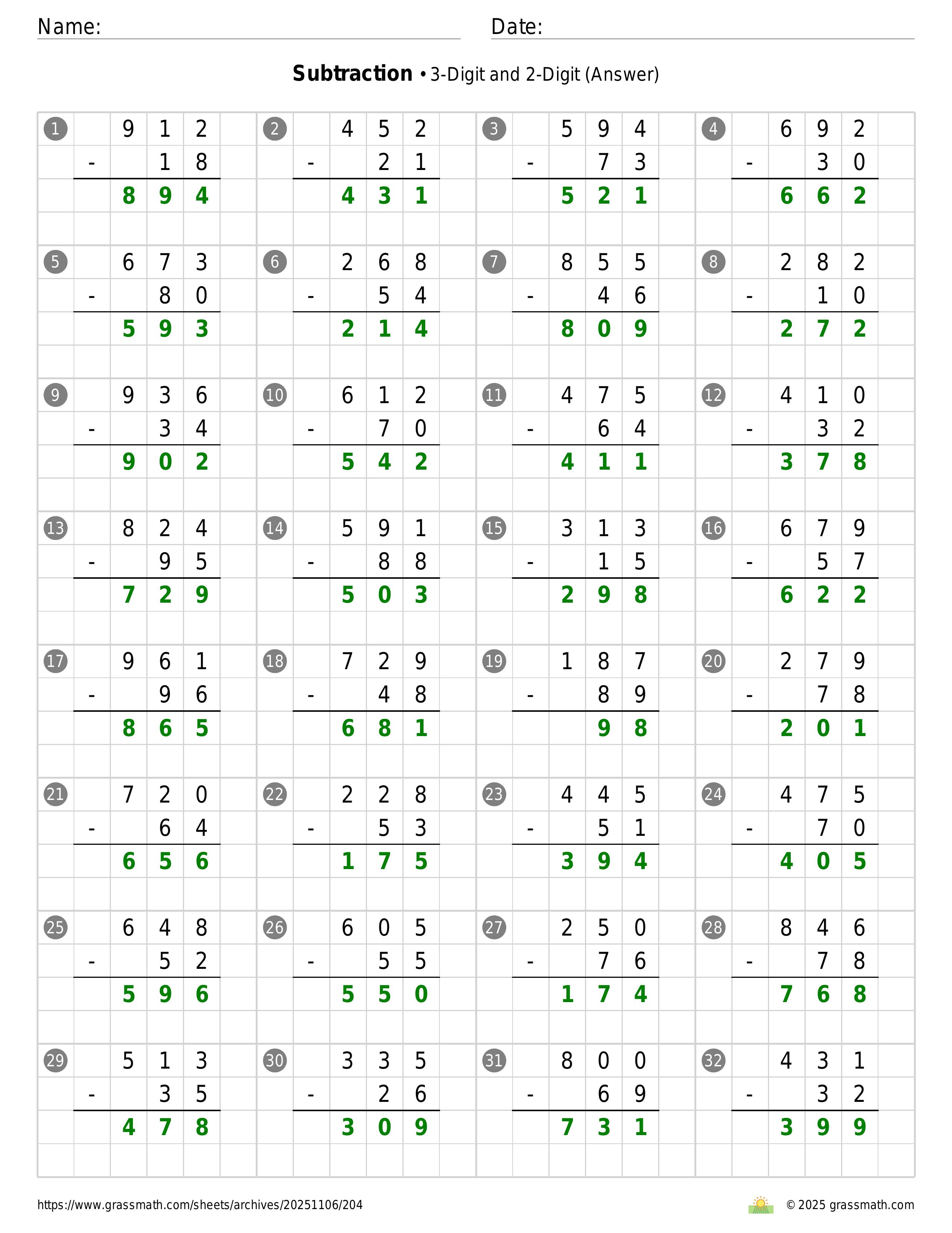 Subtraction 3-Digit and 2-Digit