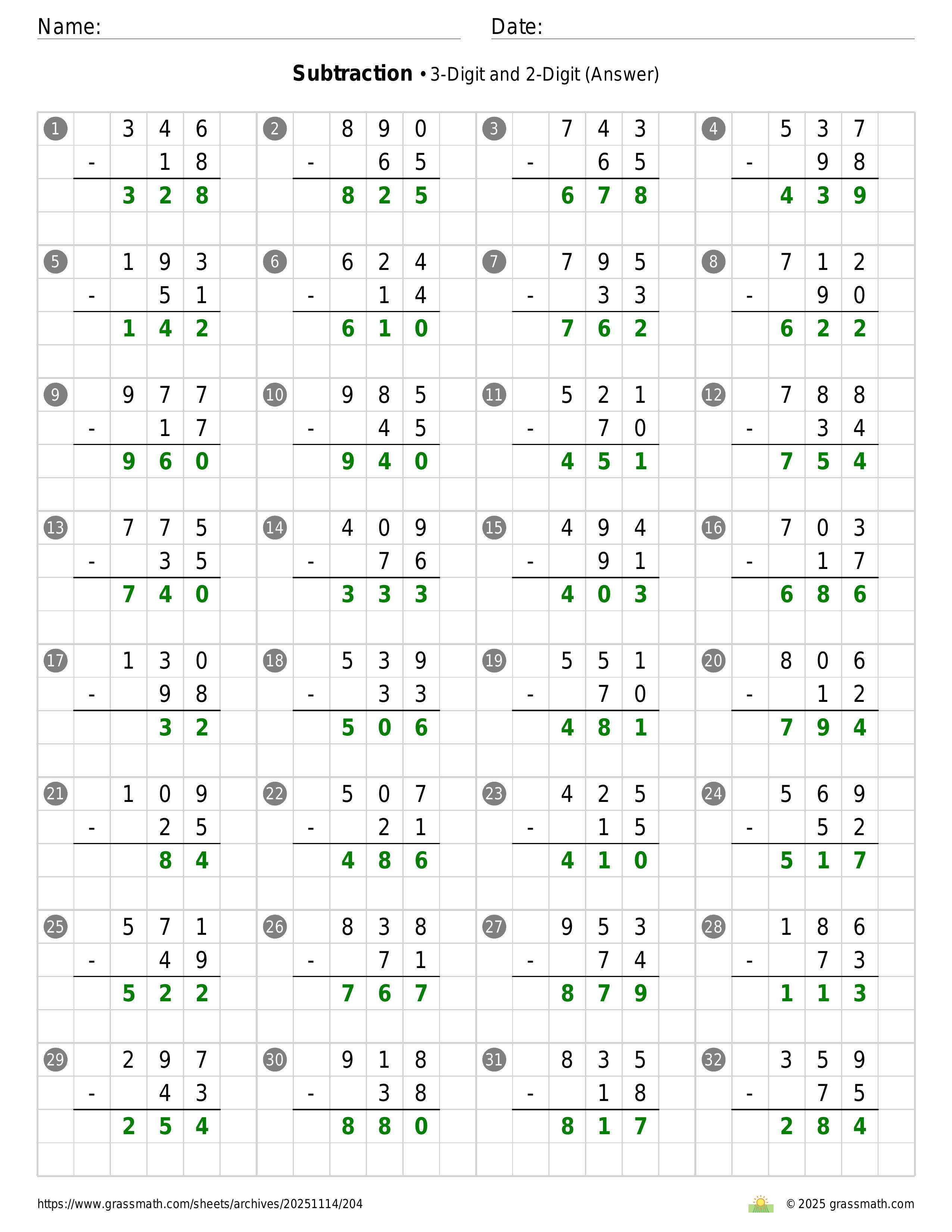 Subtraction 3-Digit and 2-Digit