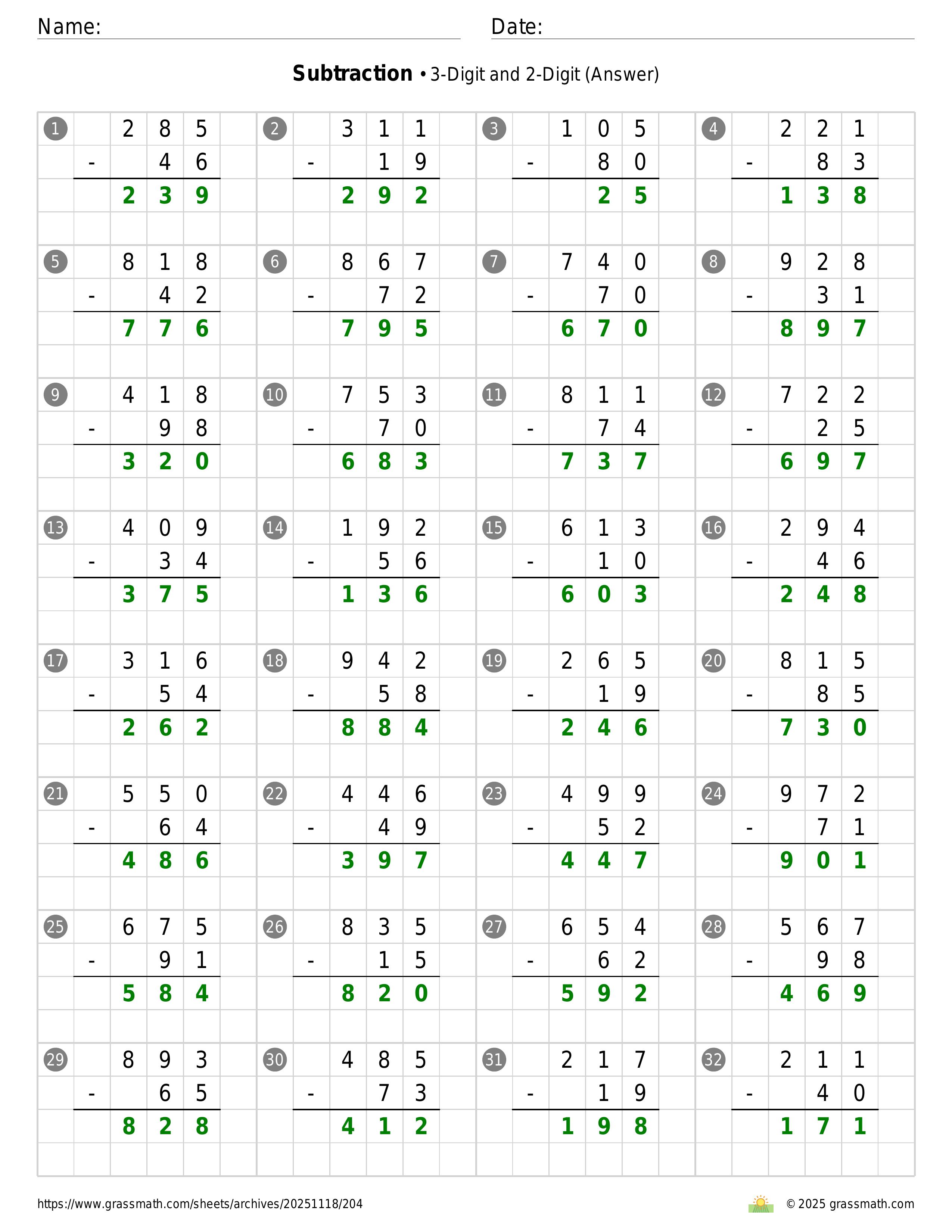 Subtraction 3-Digit and 2-Digit