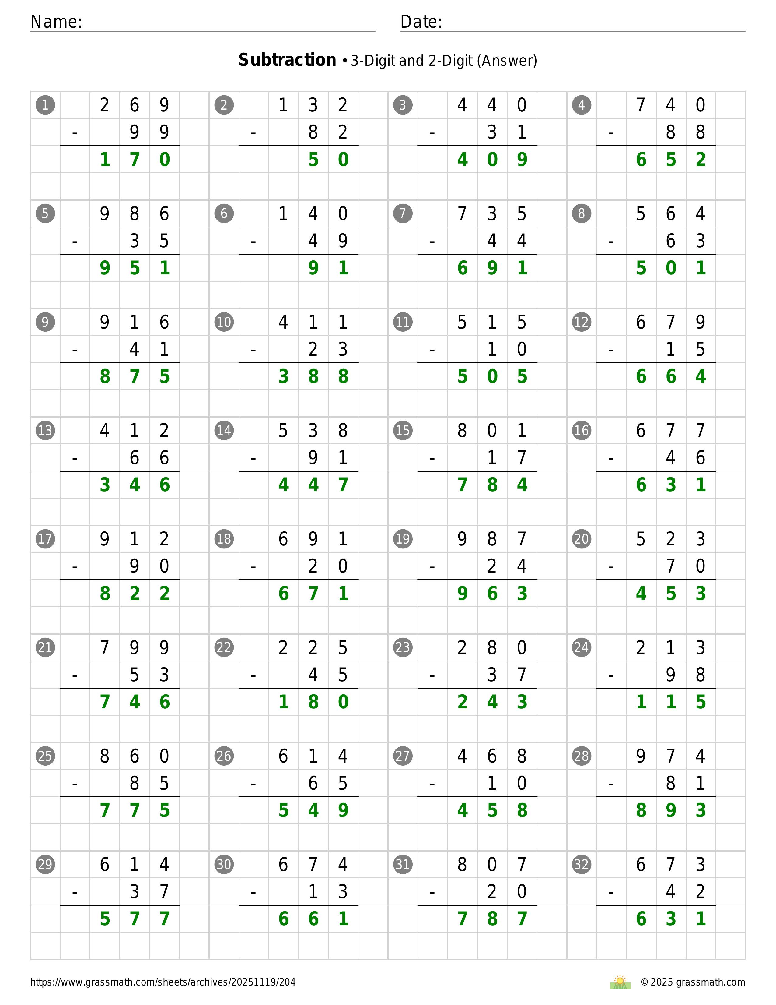 Subtraction 3-Digit and 2-Digit