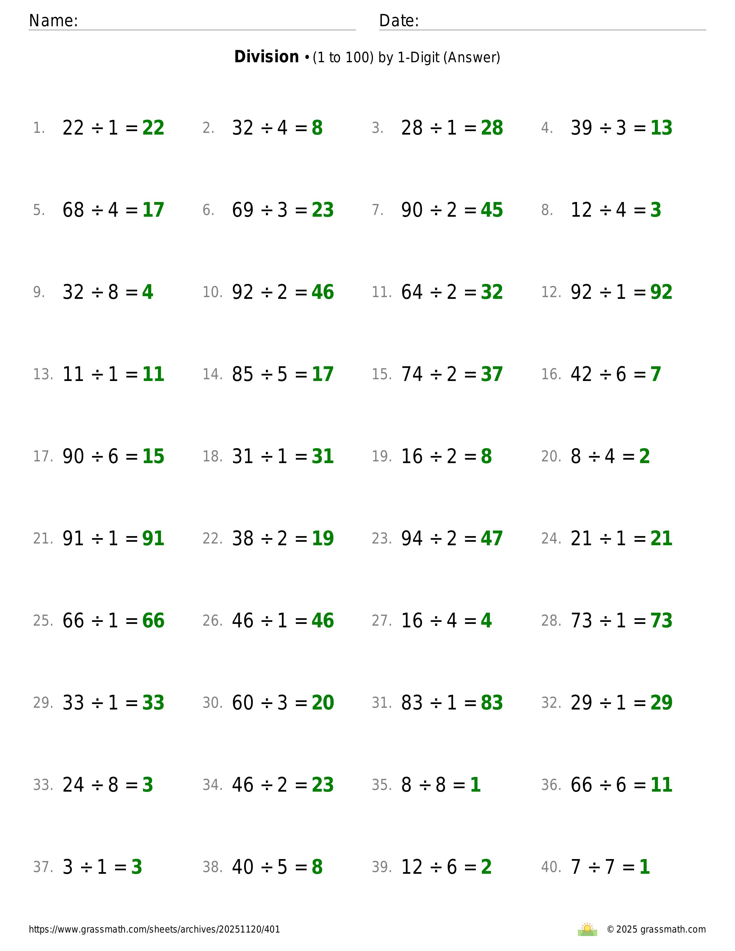 Division (1 to 100) by 1-Digit