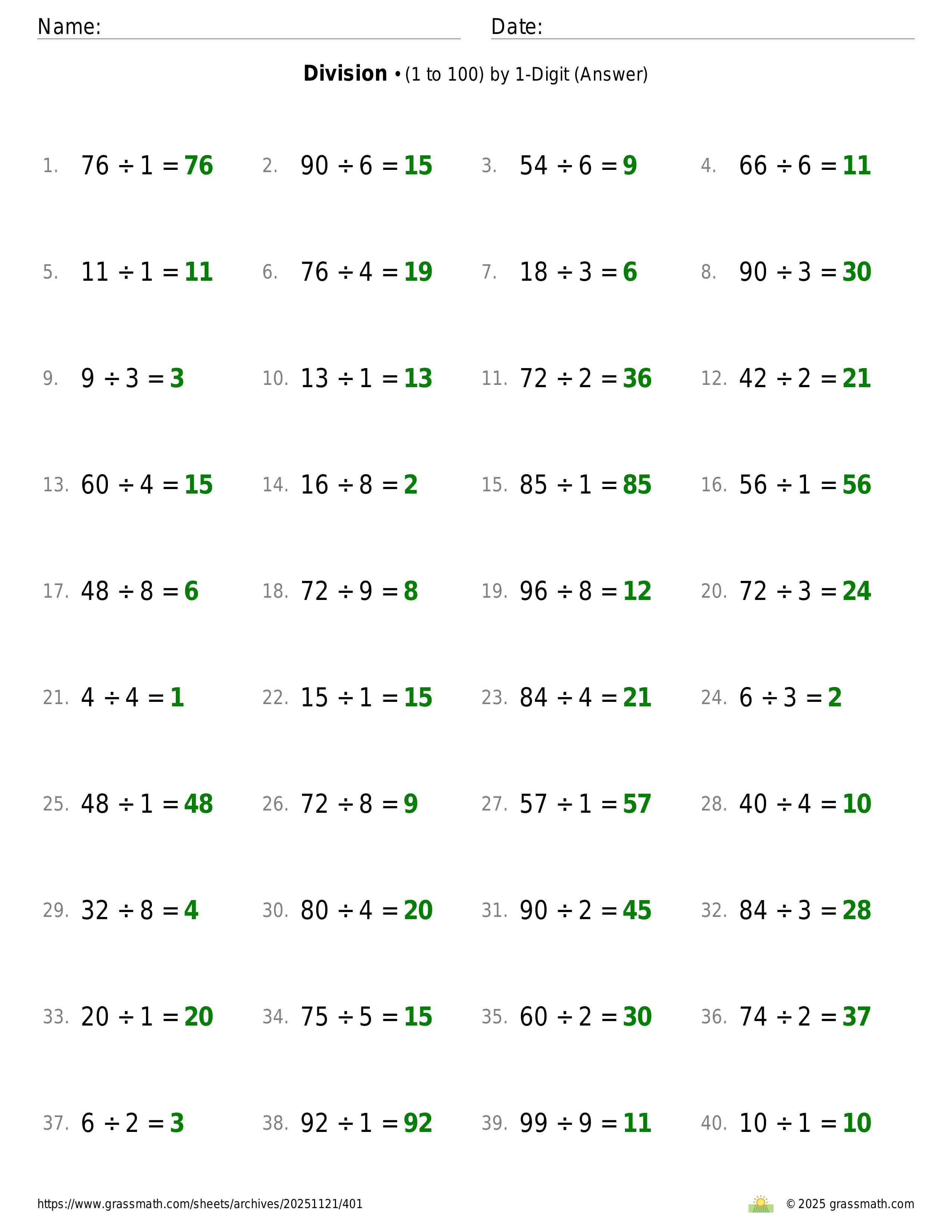 Division (1 to 100) by 1-Digit