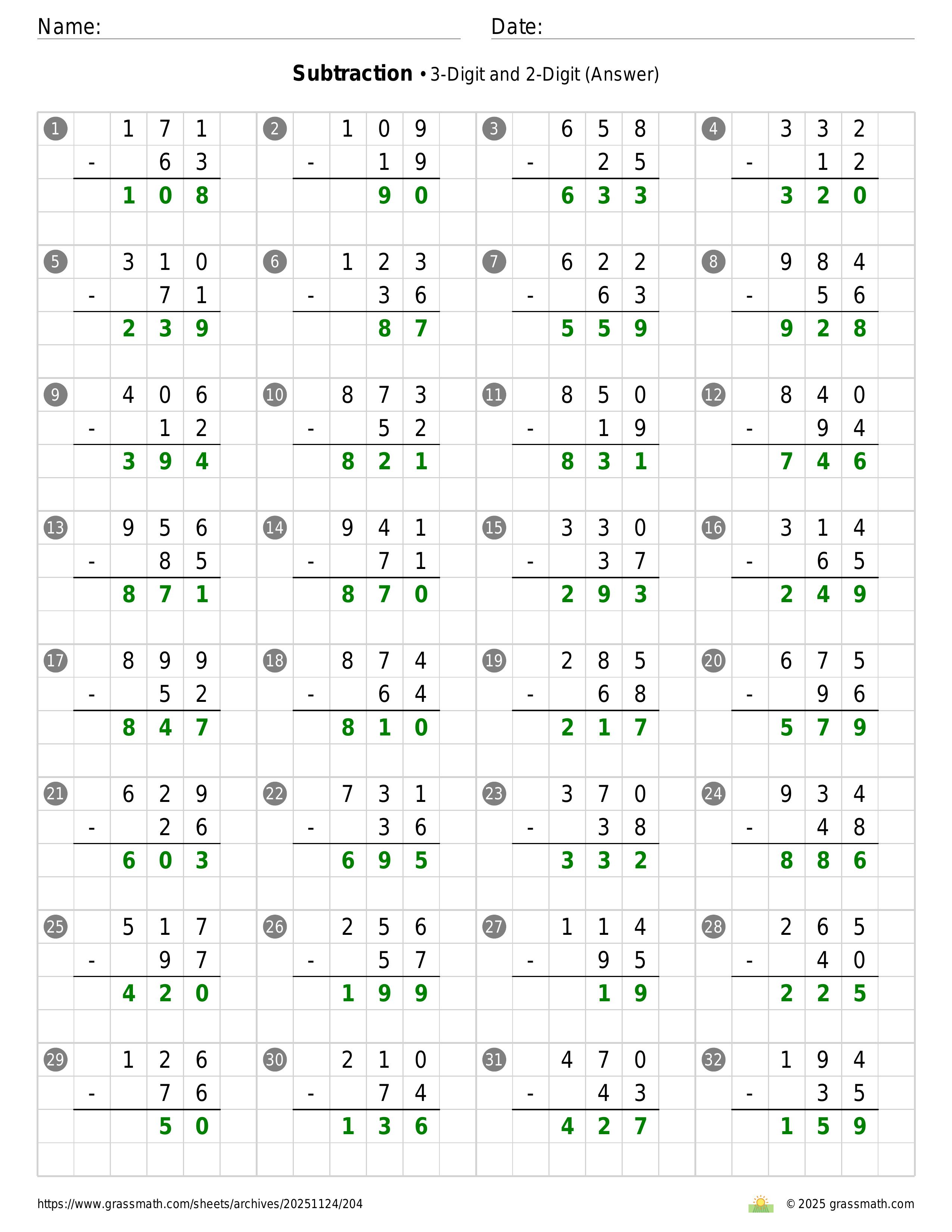 Subtraction 3-Digit and 2-Digit