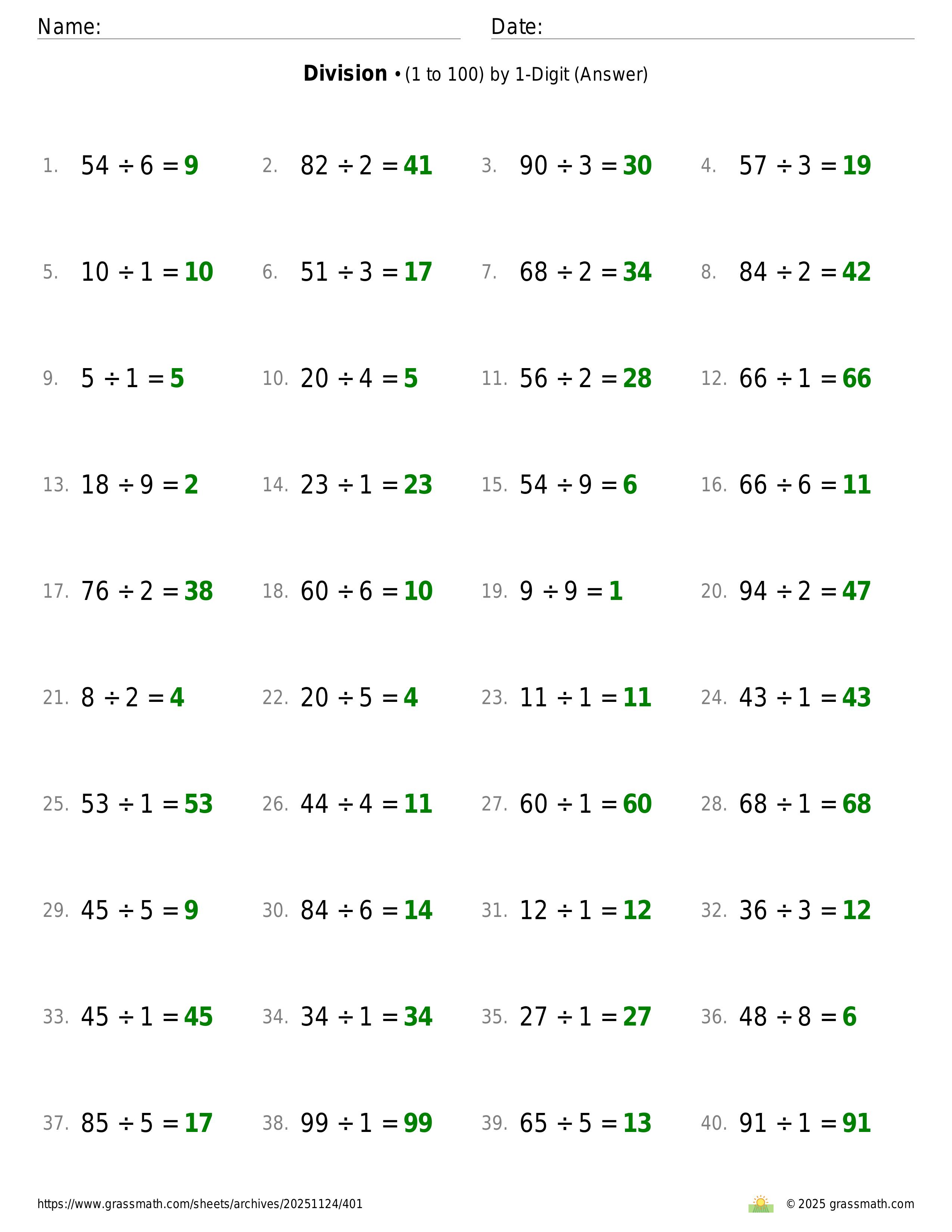 Division (1 to 100) by 1-Digit
