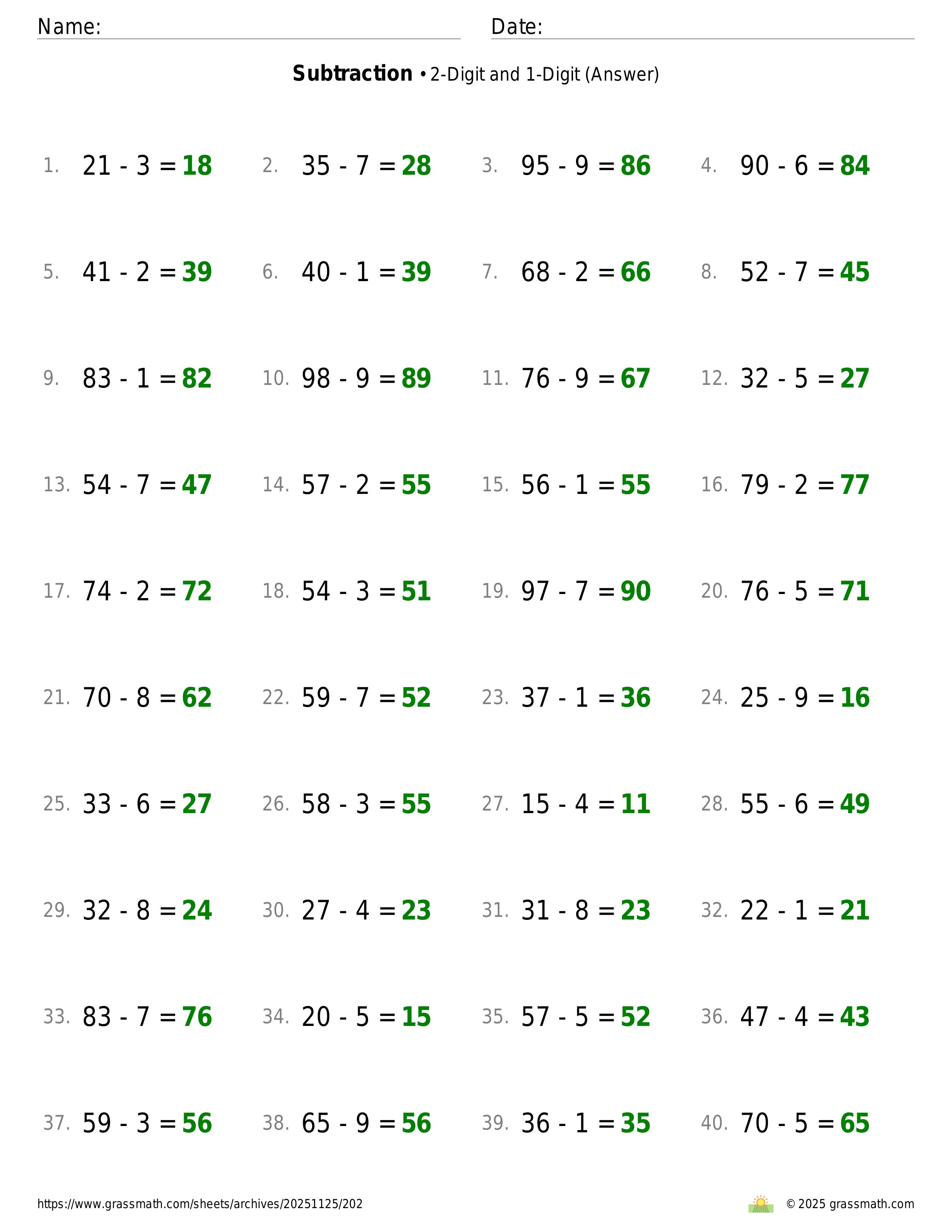 Subtraction 2-Digit and 1-Digit