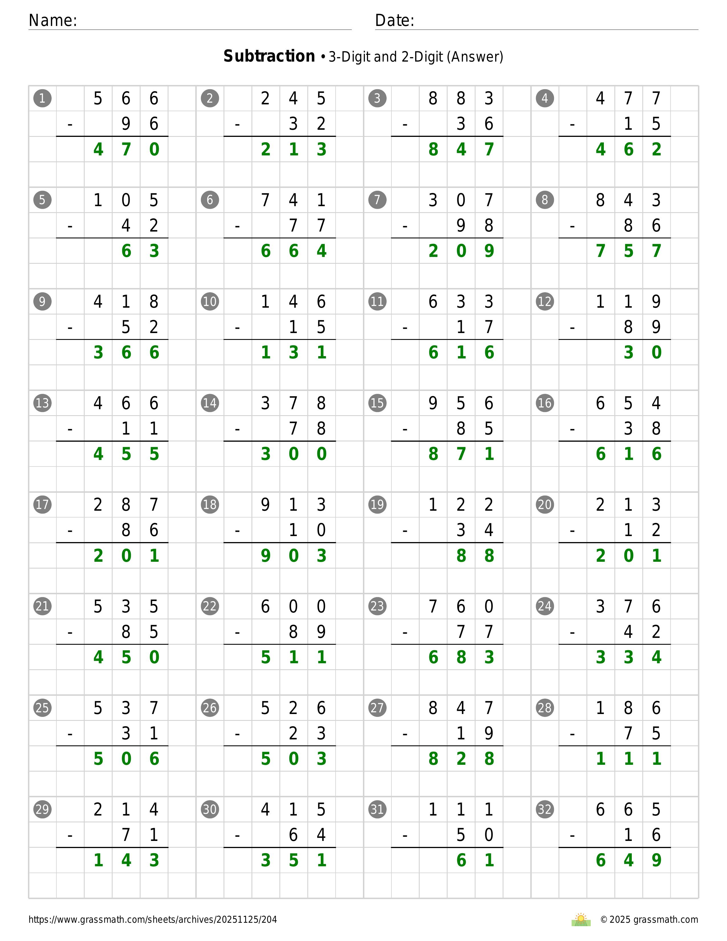 Subtraction 3-Digit and 2-Digit