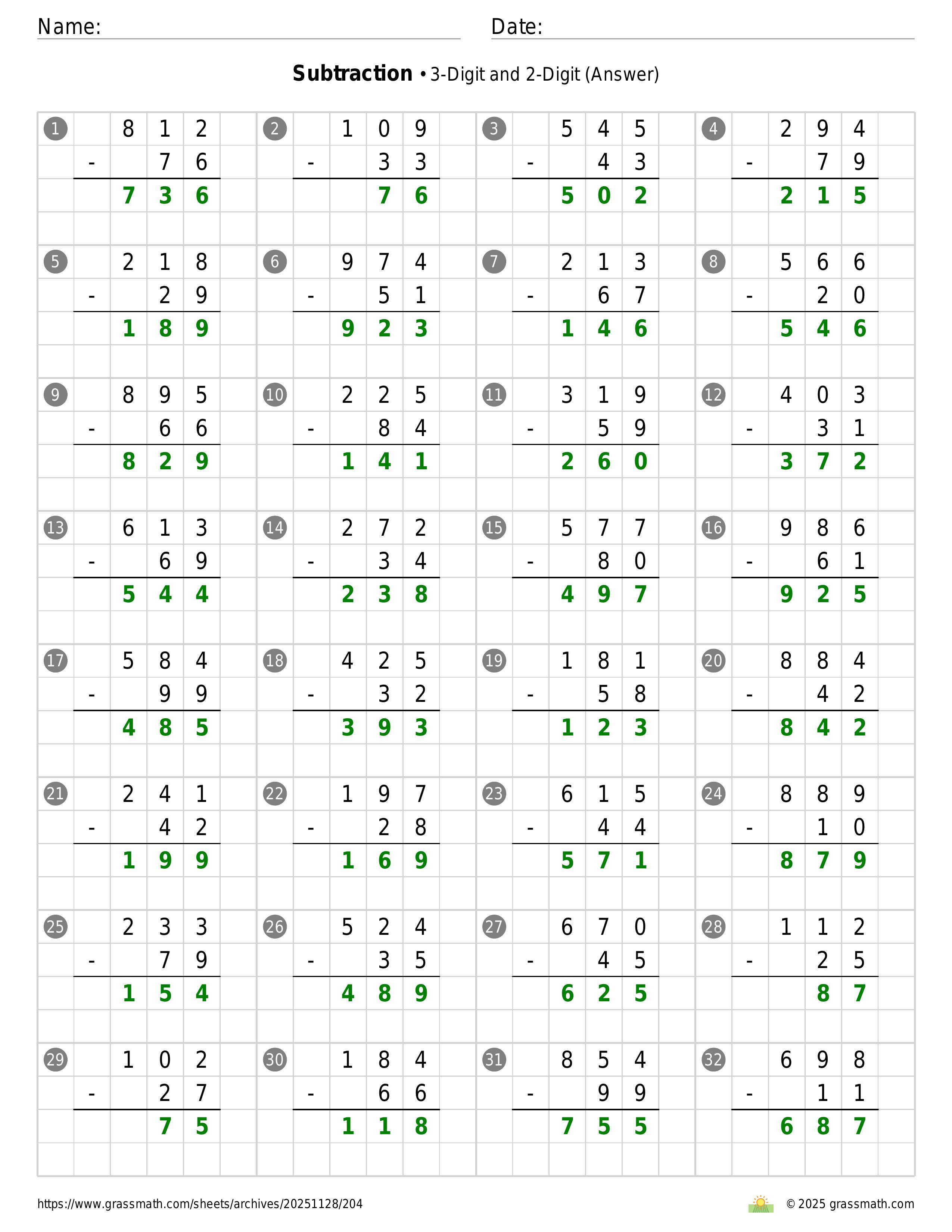 Subtraction 3-Digit and 2-Digit