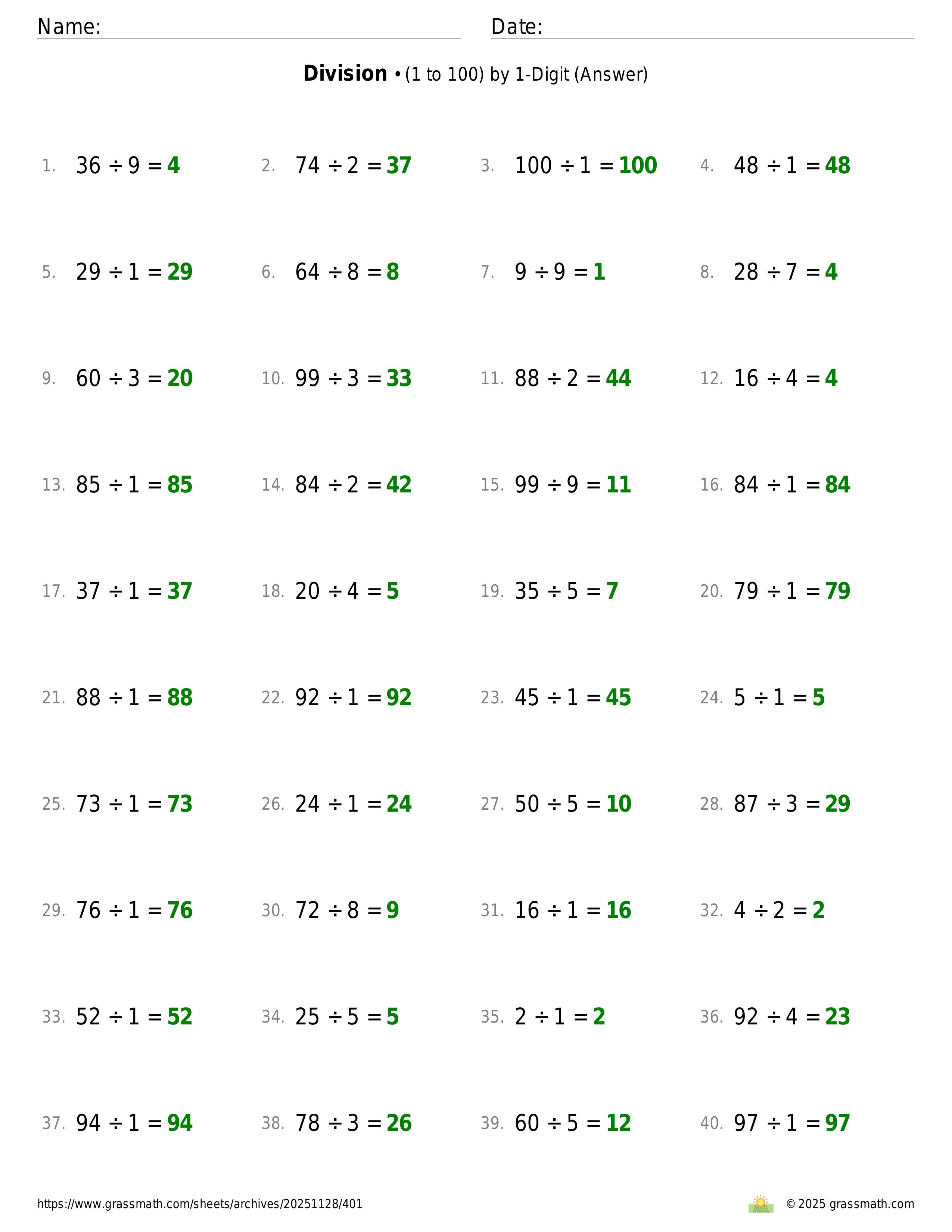 Division (1 to 100) by 1-Digit