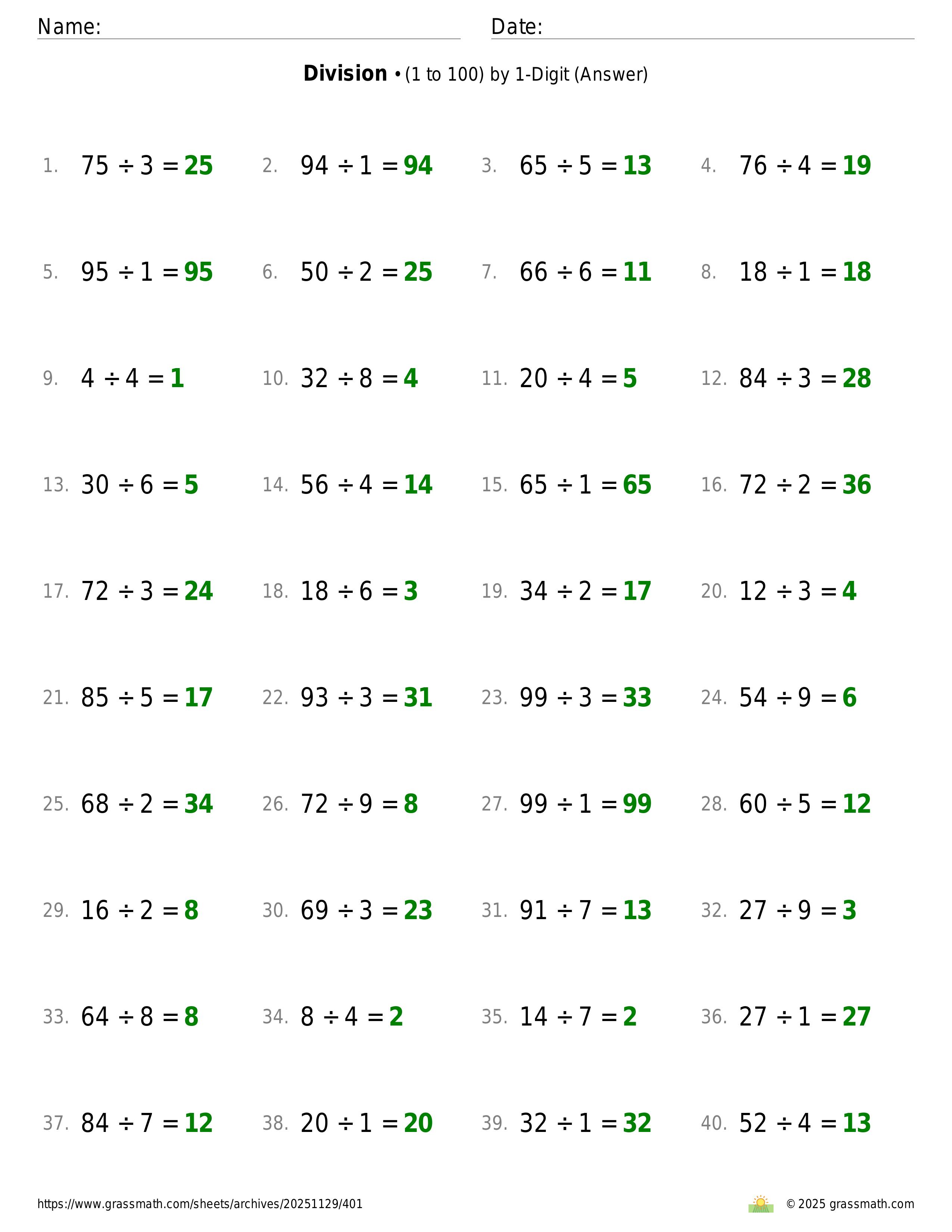 Division (1 to 100) by 1-Digit
