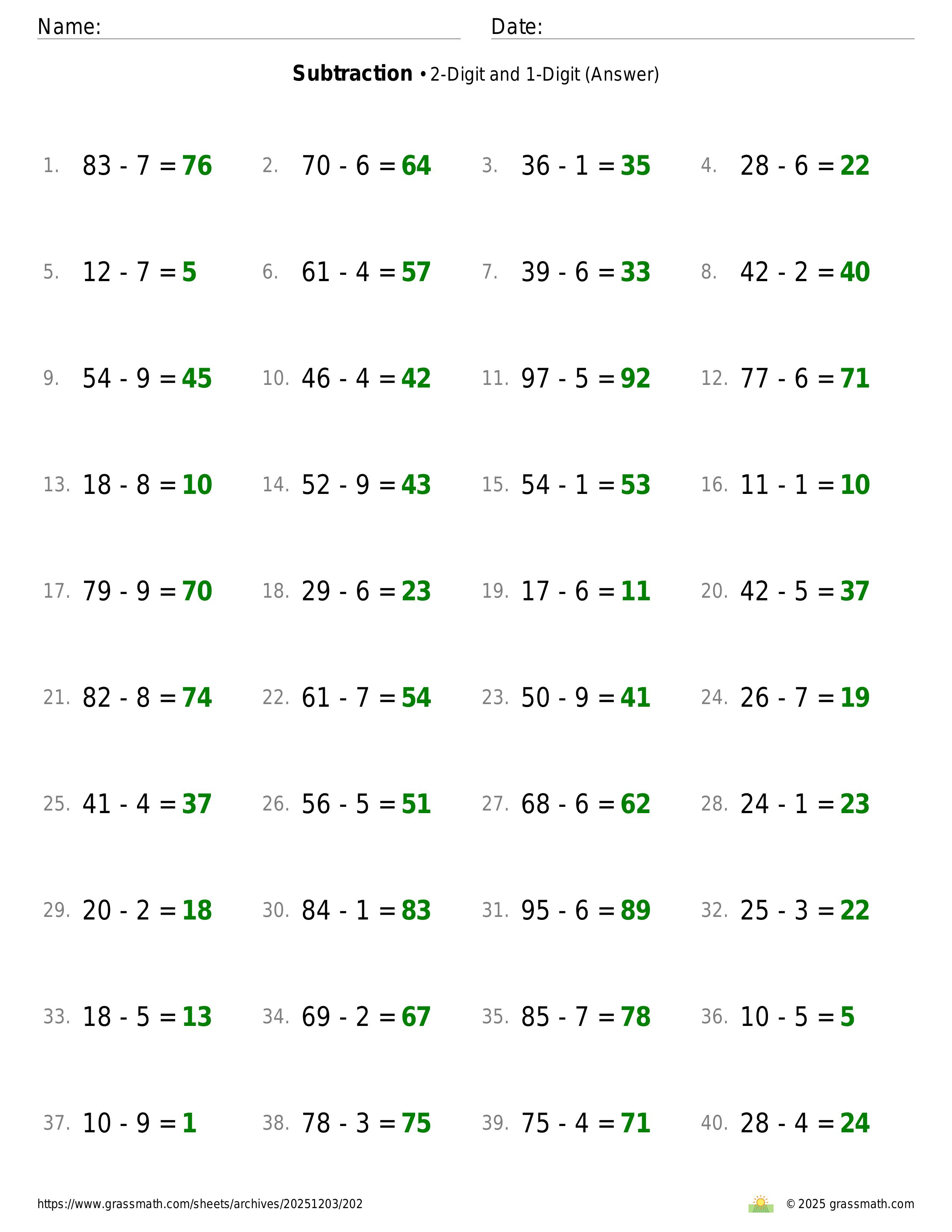 Subtraction 2-Digit and 1-Digit