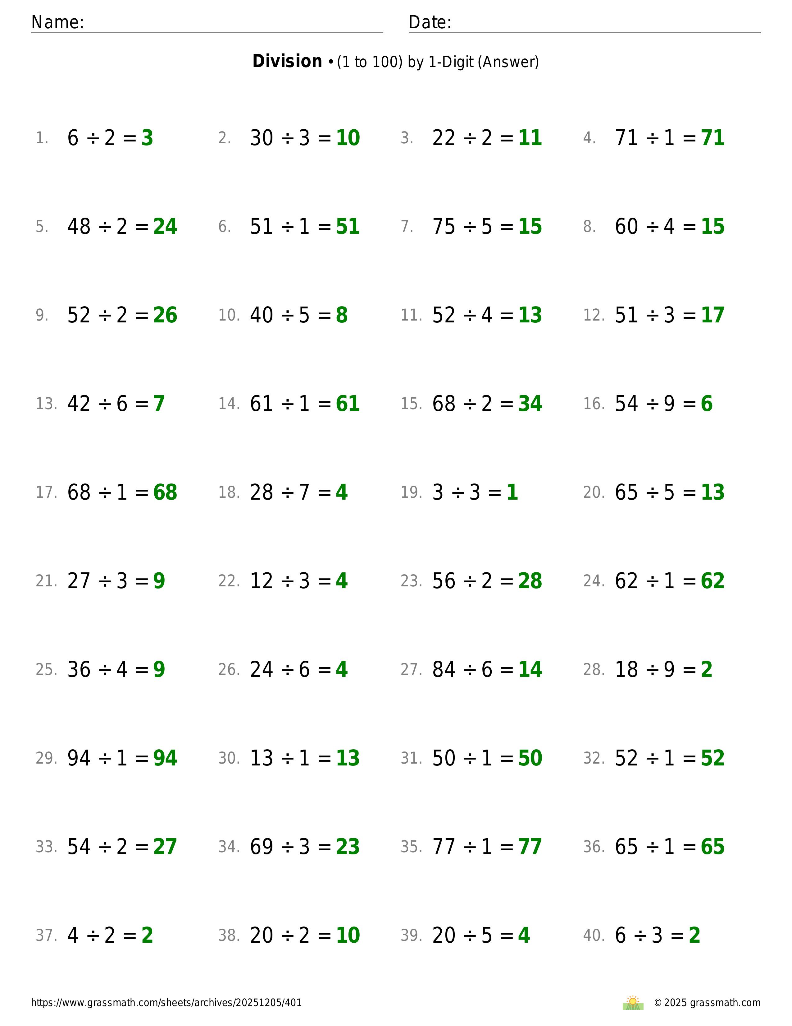 Division (1 to 100) by 1-Digit