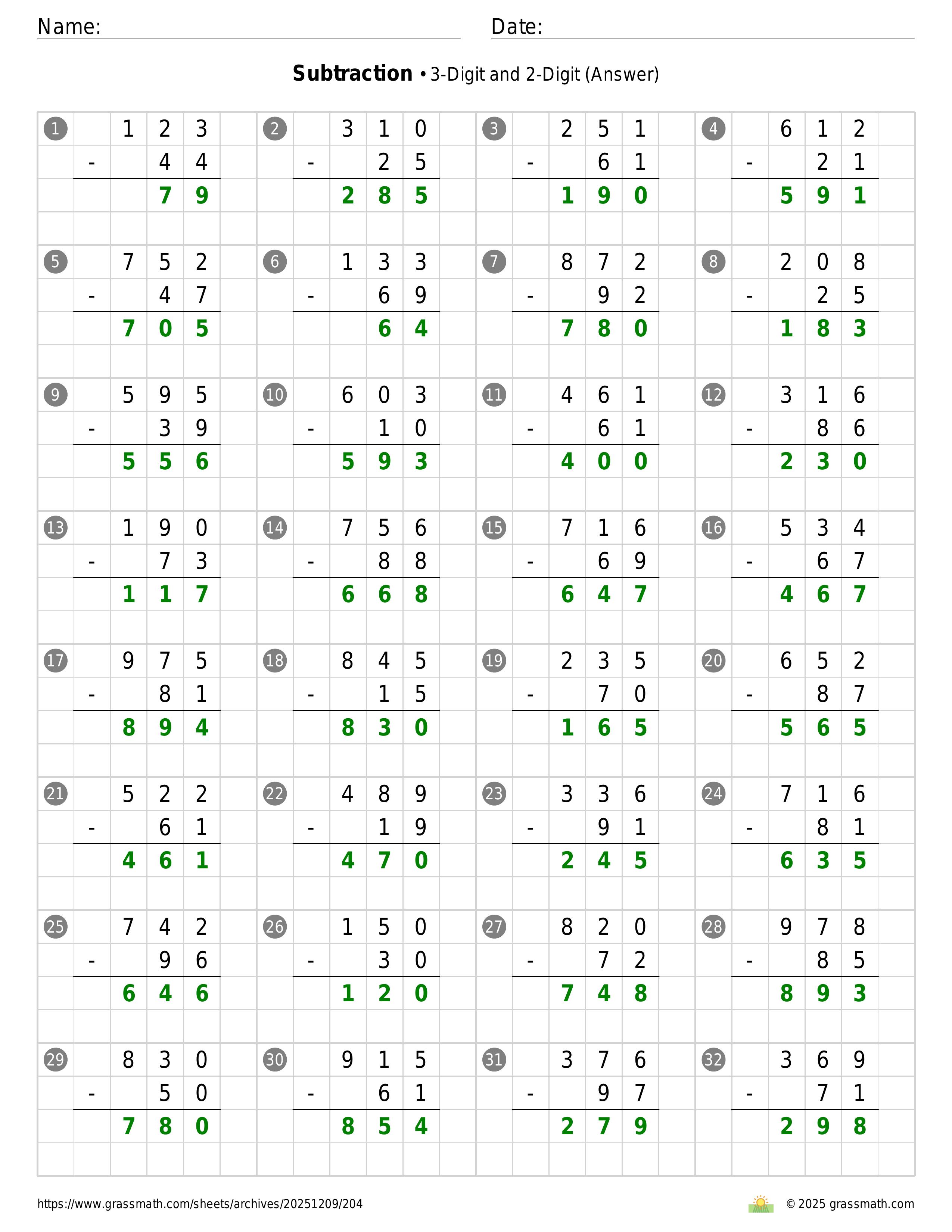 Subtraction 3-Digit and 2-Digit