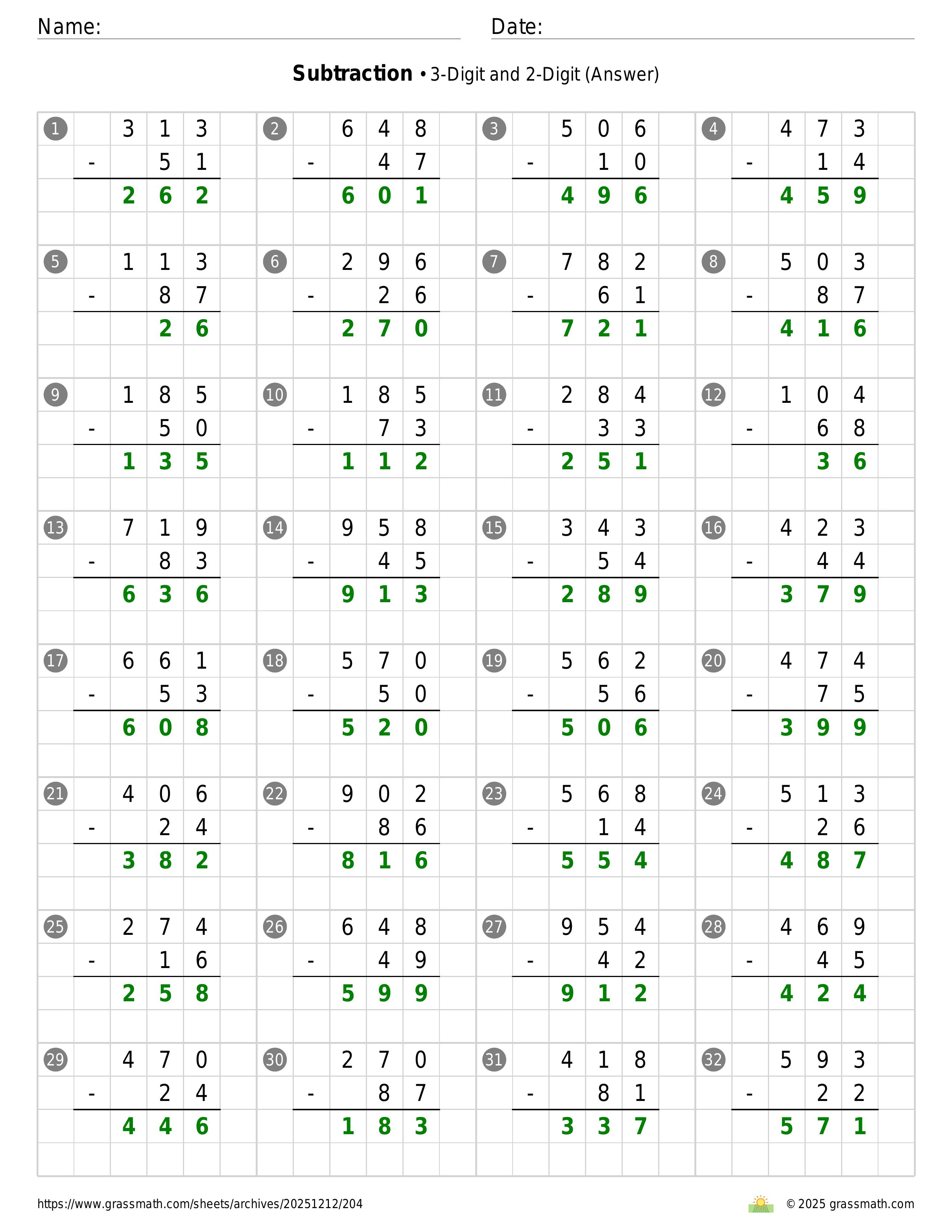 Subtraction 3-Digit and 2-Digit