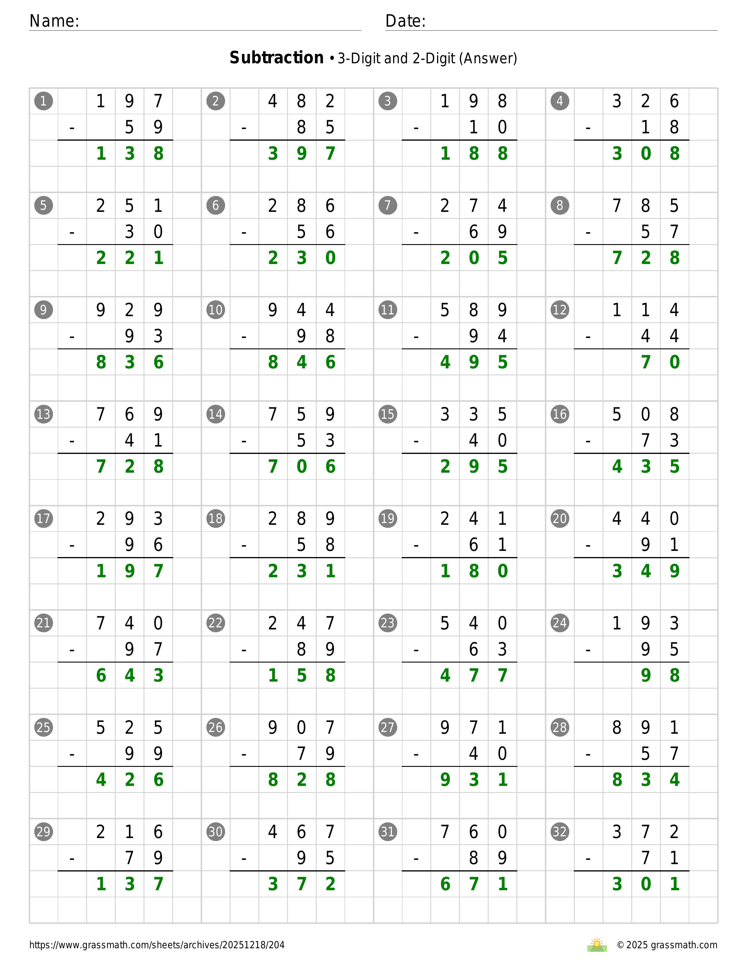 Subtraction 3-Digit and 2-Digit