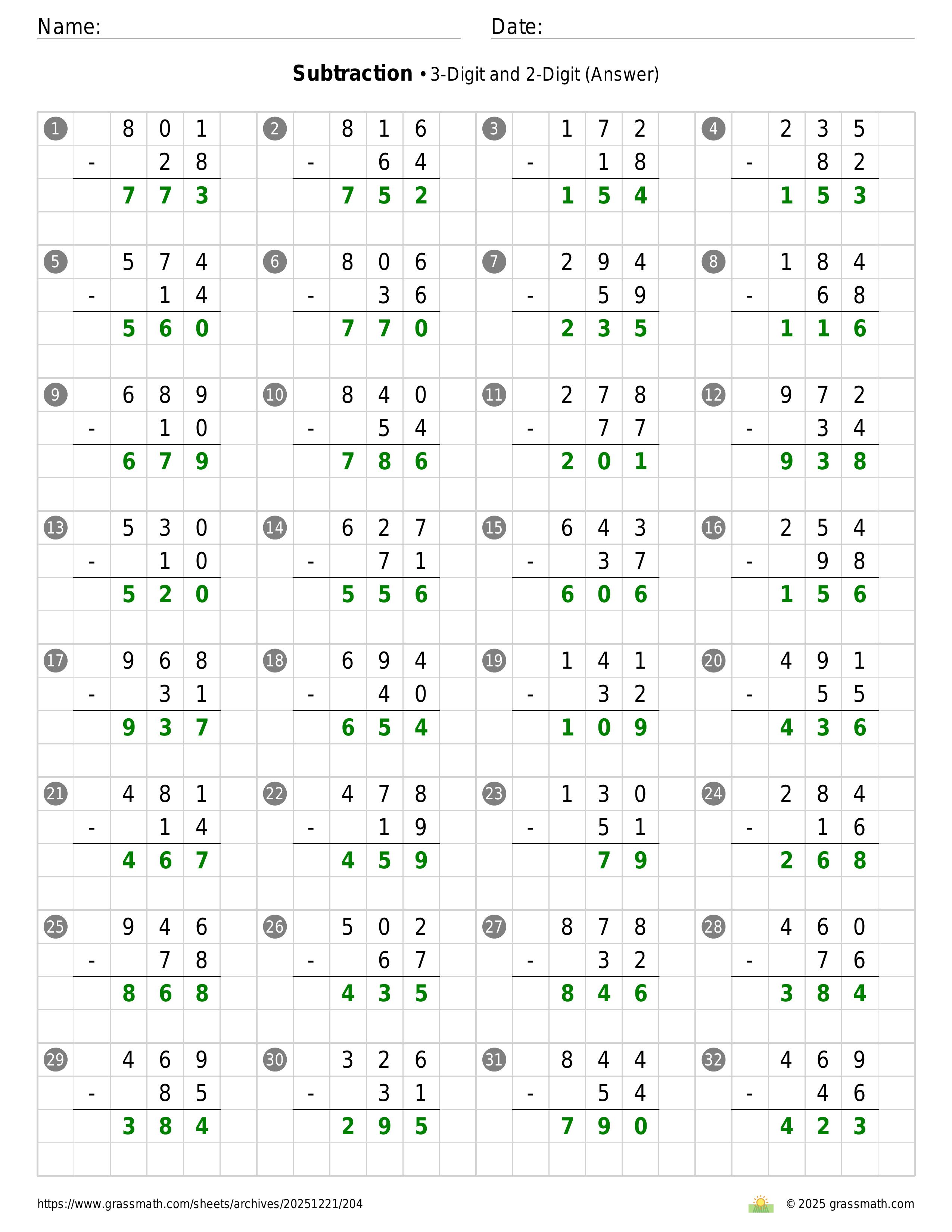 Subtraction 3-Digit and 2-Digit