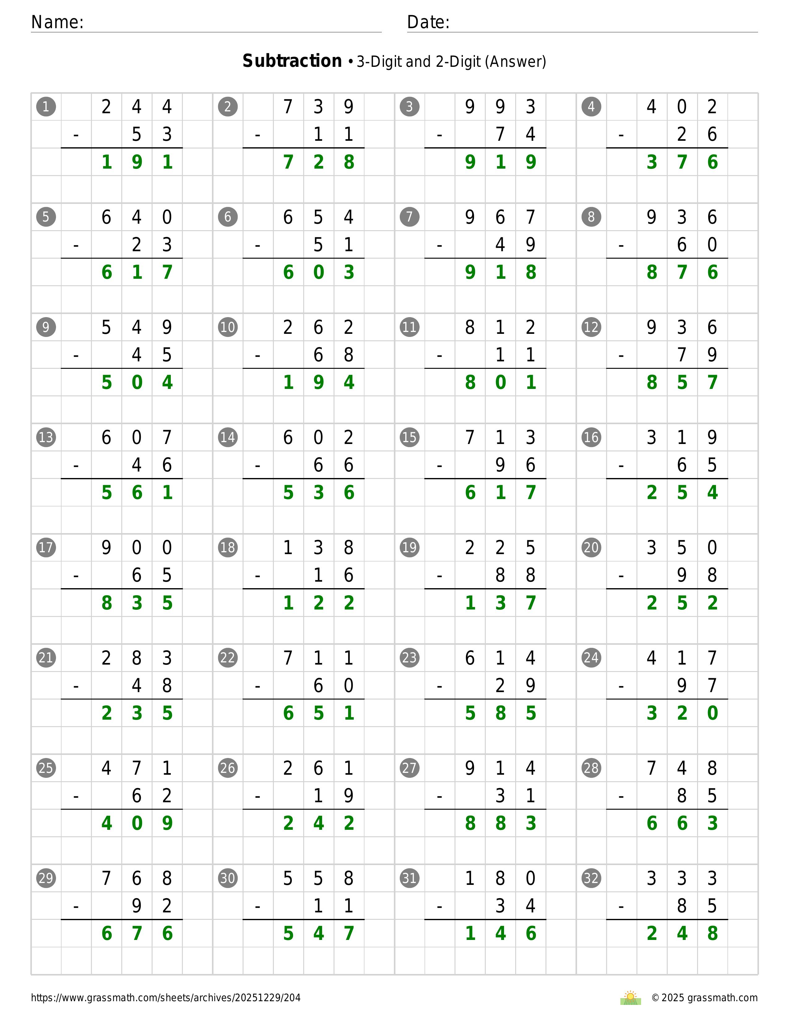 Subtraction 3-Digit and 2-Digit