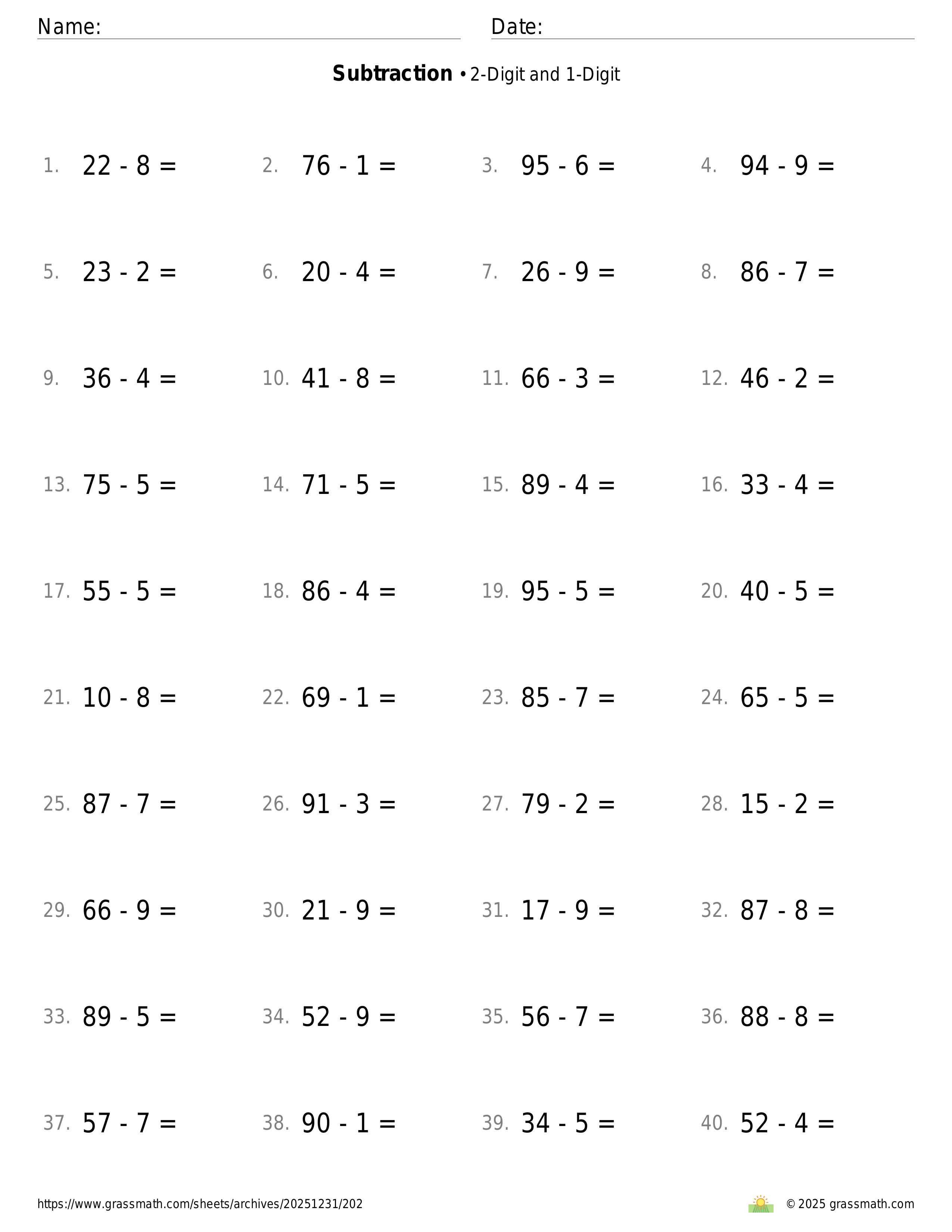 Subtraction 2-Digit and 1-Digit