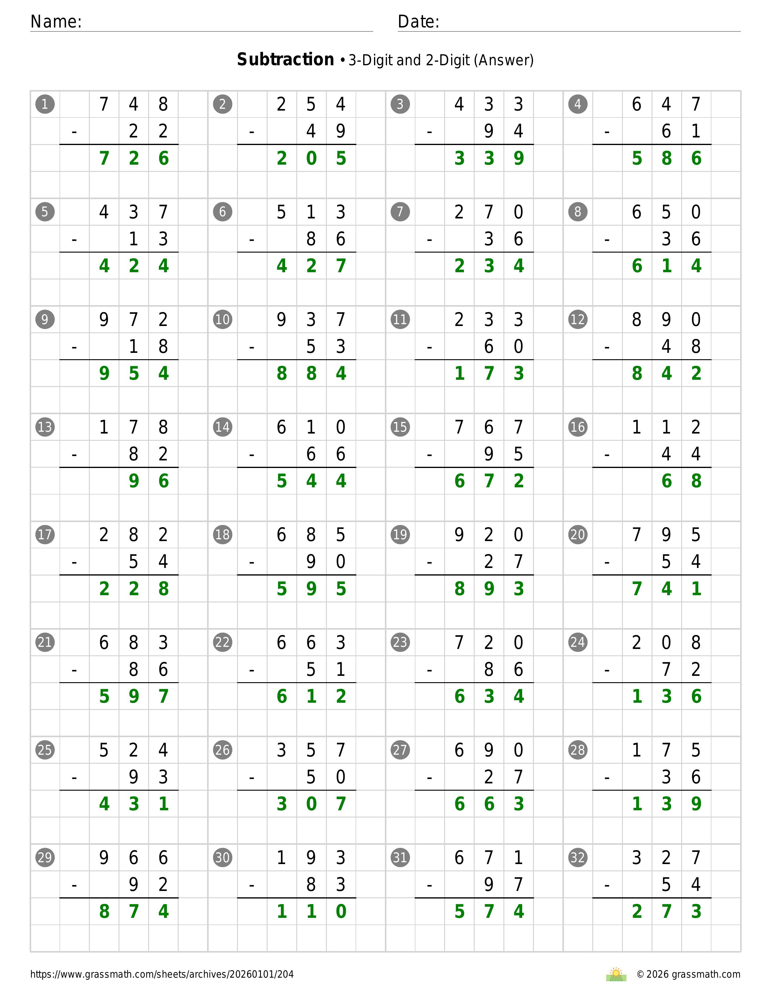 Subtraction 3-Digit and 2-Digit
